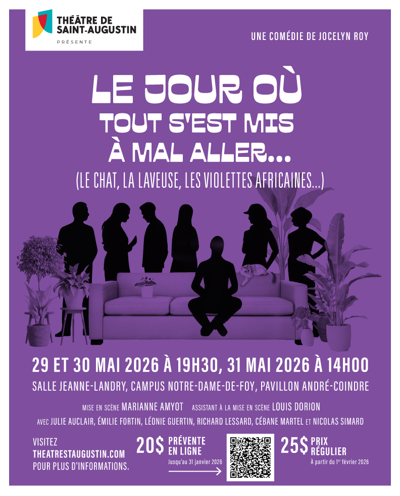 Le Théâtre de Saint-Augustin est fier de présenter sa prochaine production théâtrale, une comédie rythmée et pleine de rebondissements, portée par une distribution dynamique et une mise en scène soignée.